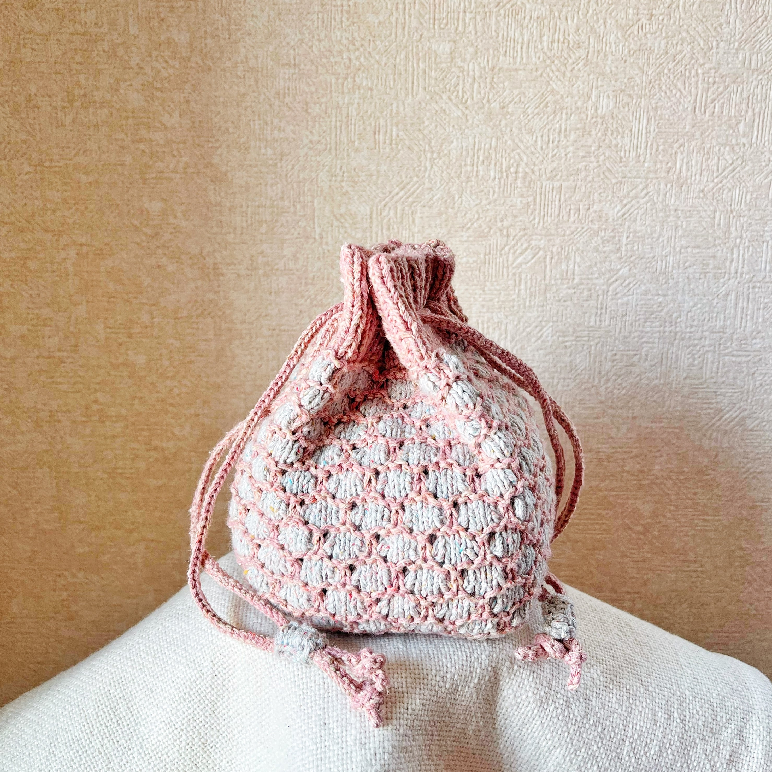 コットンニットの巾着バッグ ピンク&ライトグレーのご紹介です!