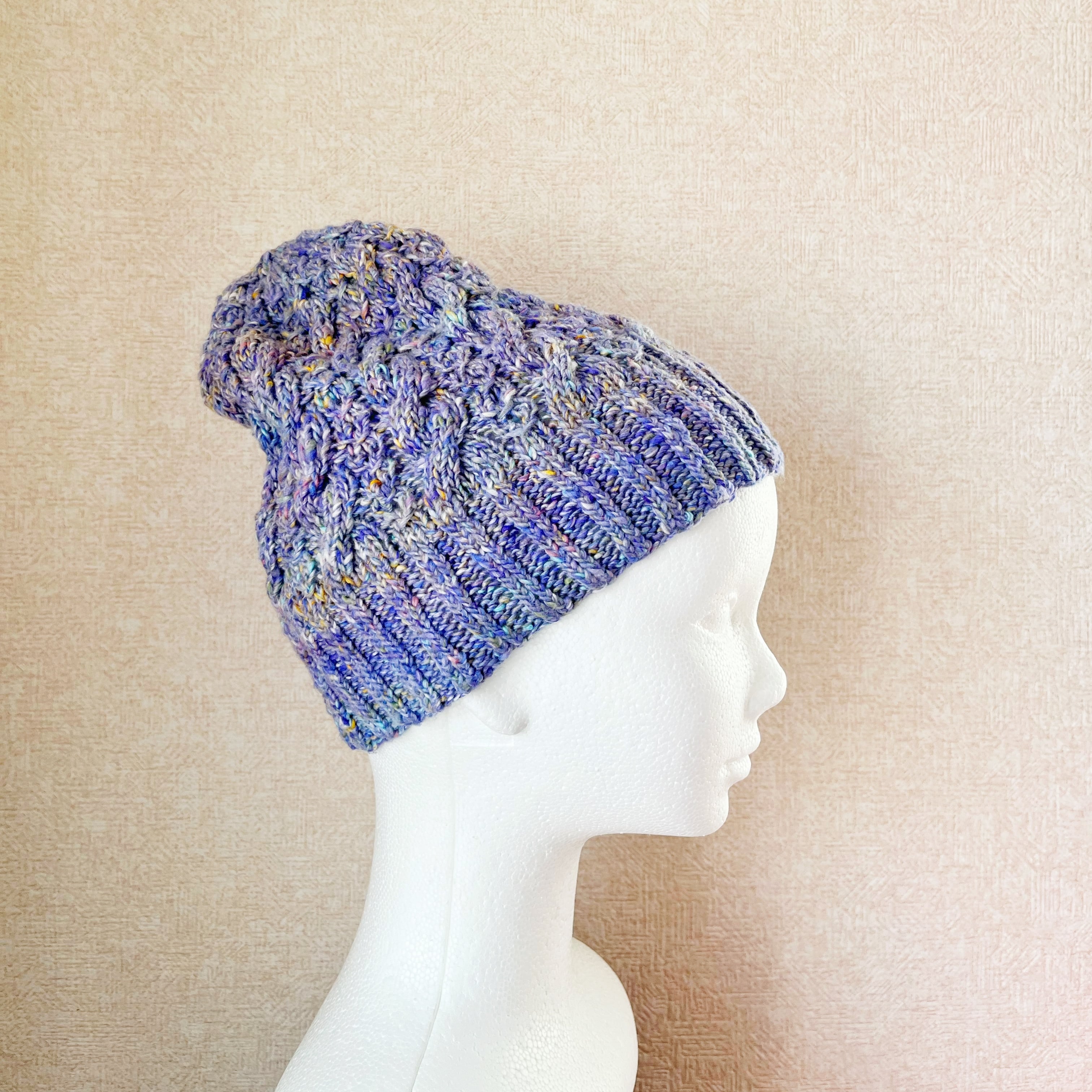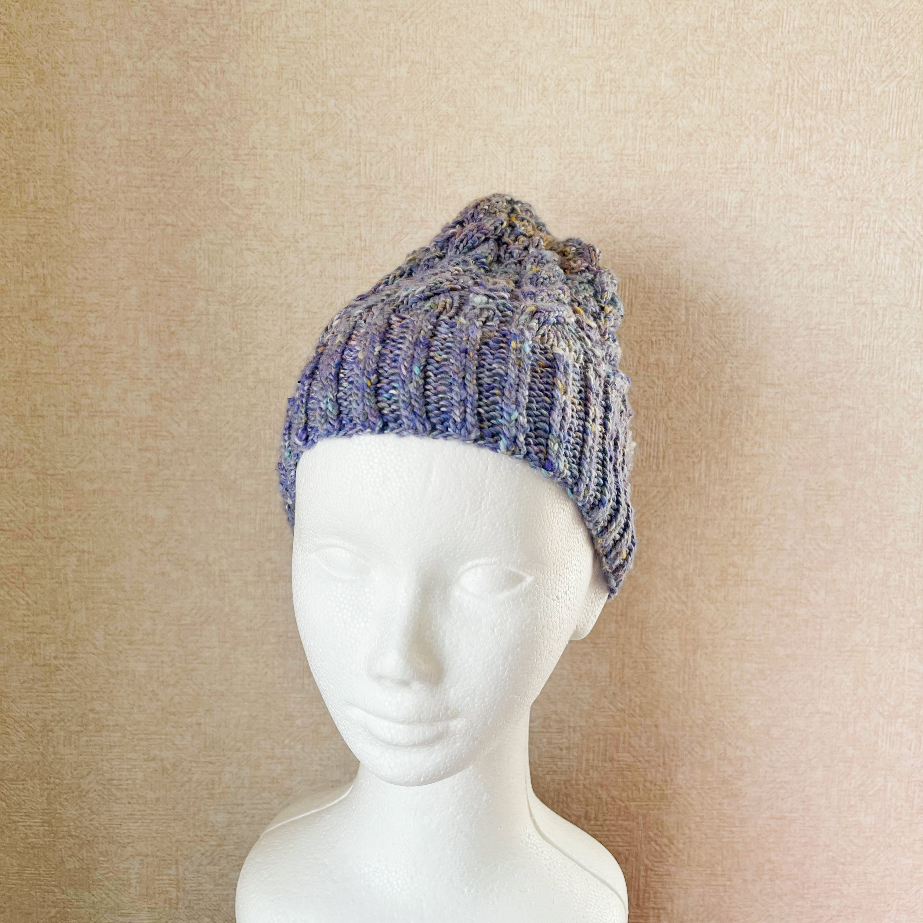 このニット帽は、繊細な編み模様が魅力的で、リブ部分はしっかりとフィットしつつも、柔らかな印象を与えています。紫陽花をイメージした色合いが、カジュアルなスタイルからお出かけスタイルまで幅広く活用できるデザインです。