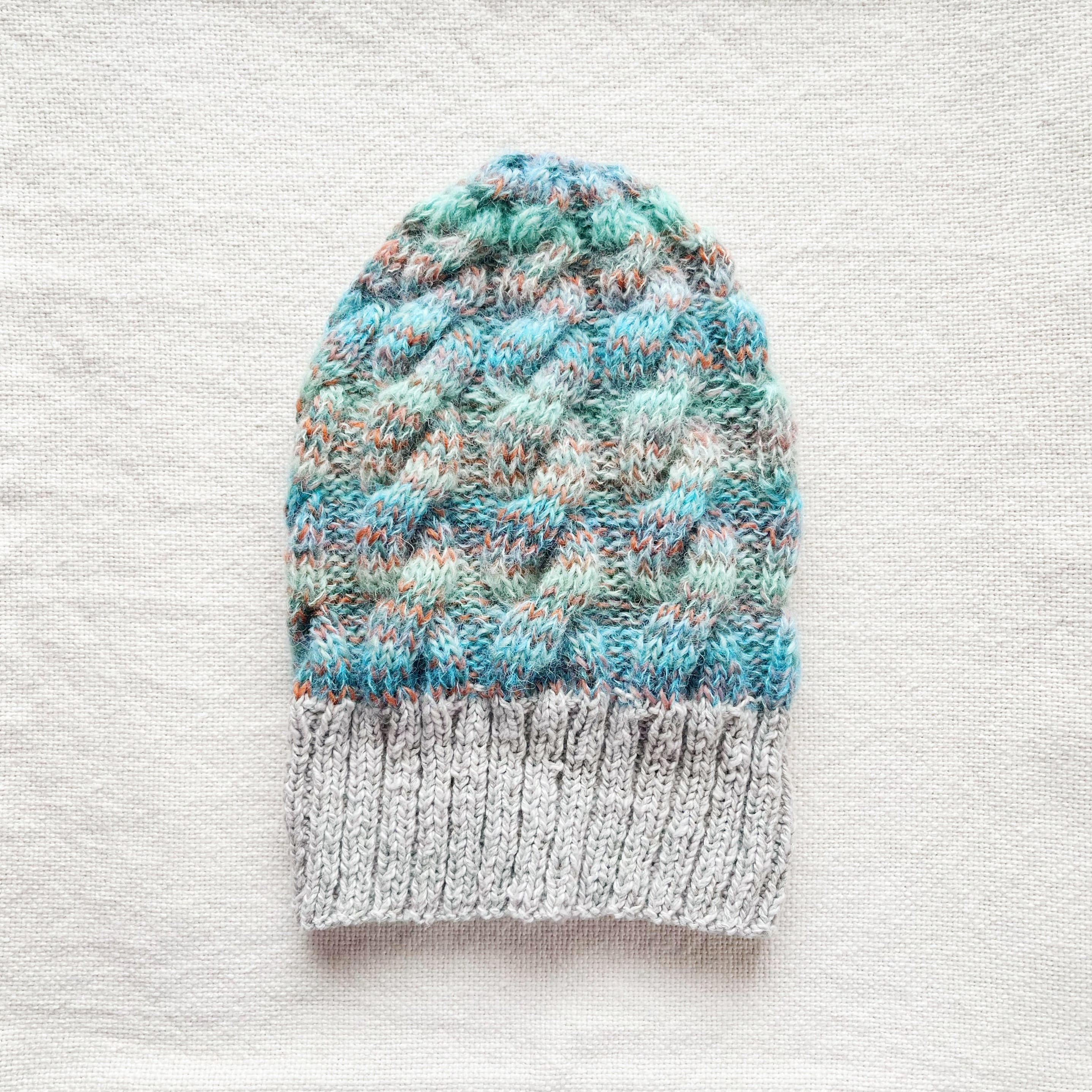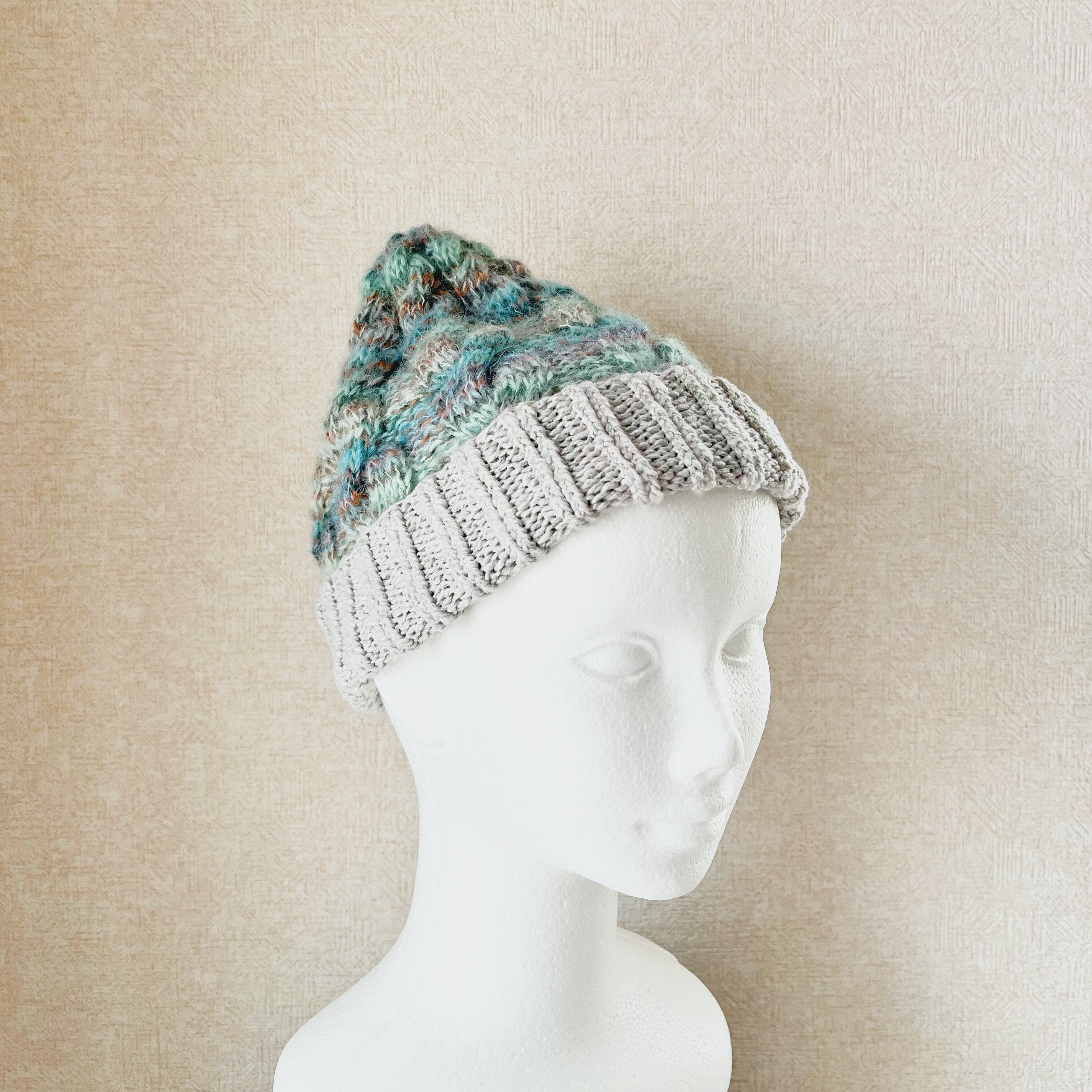 コットン素材のリブと、ウール糸のトップを組み合わせて編んだニット帽です