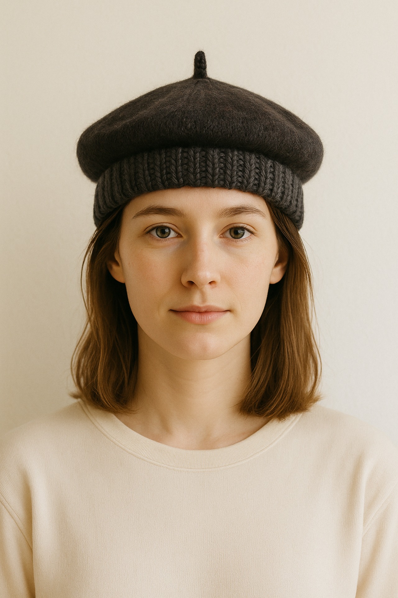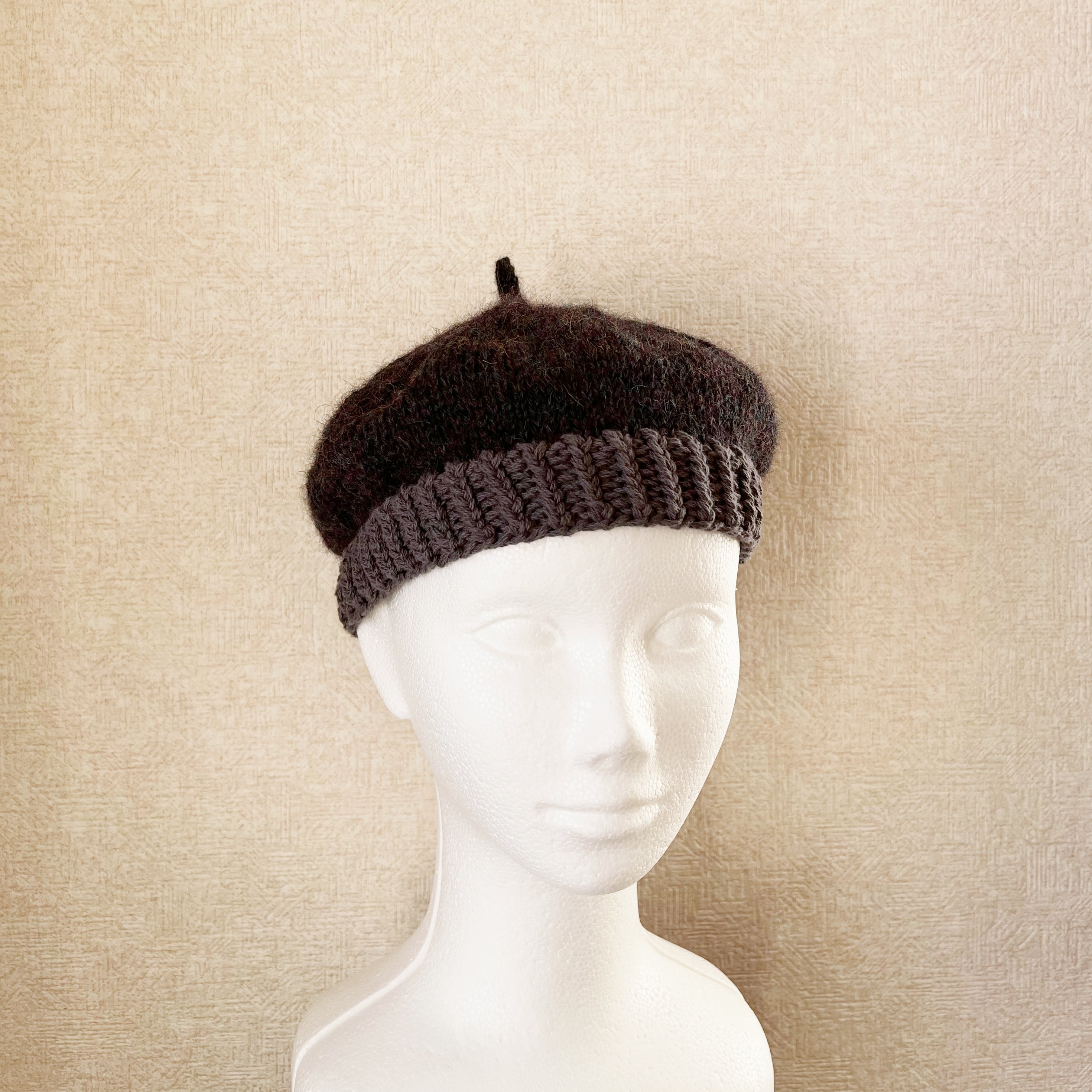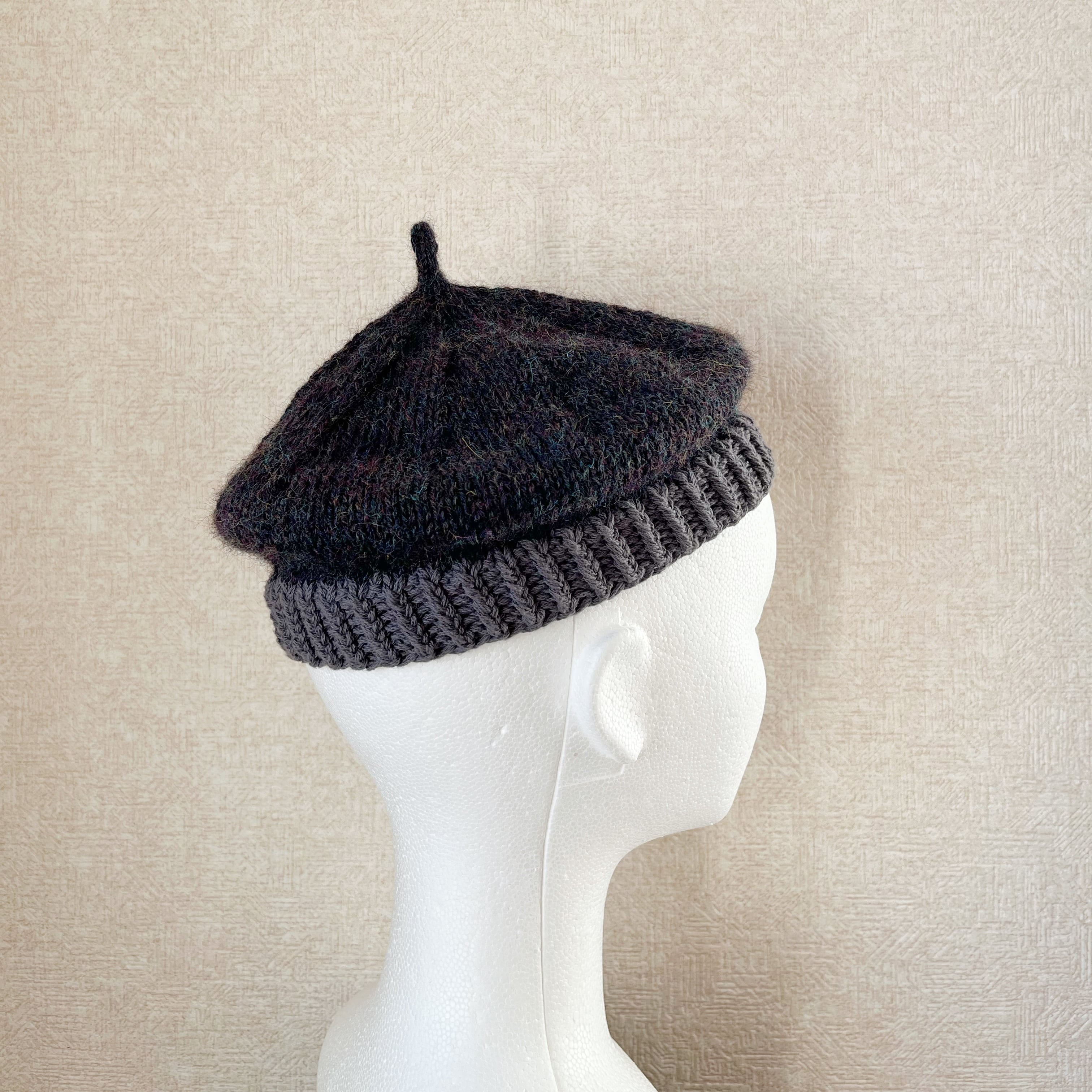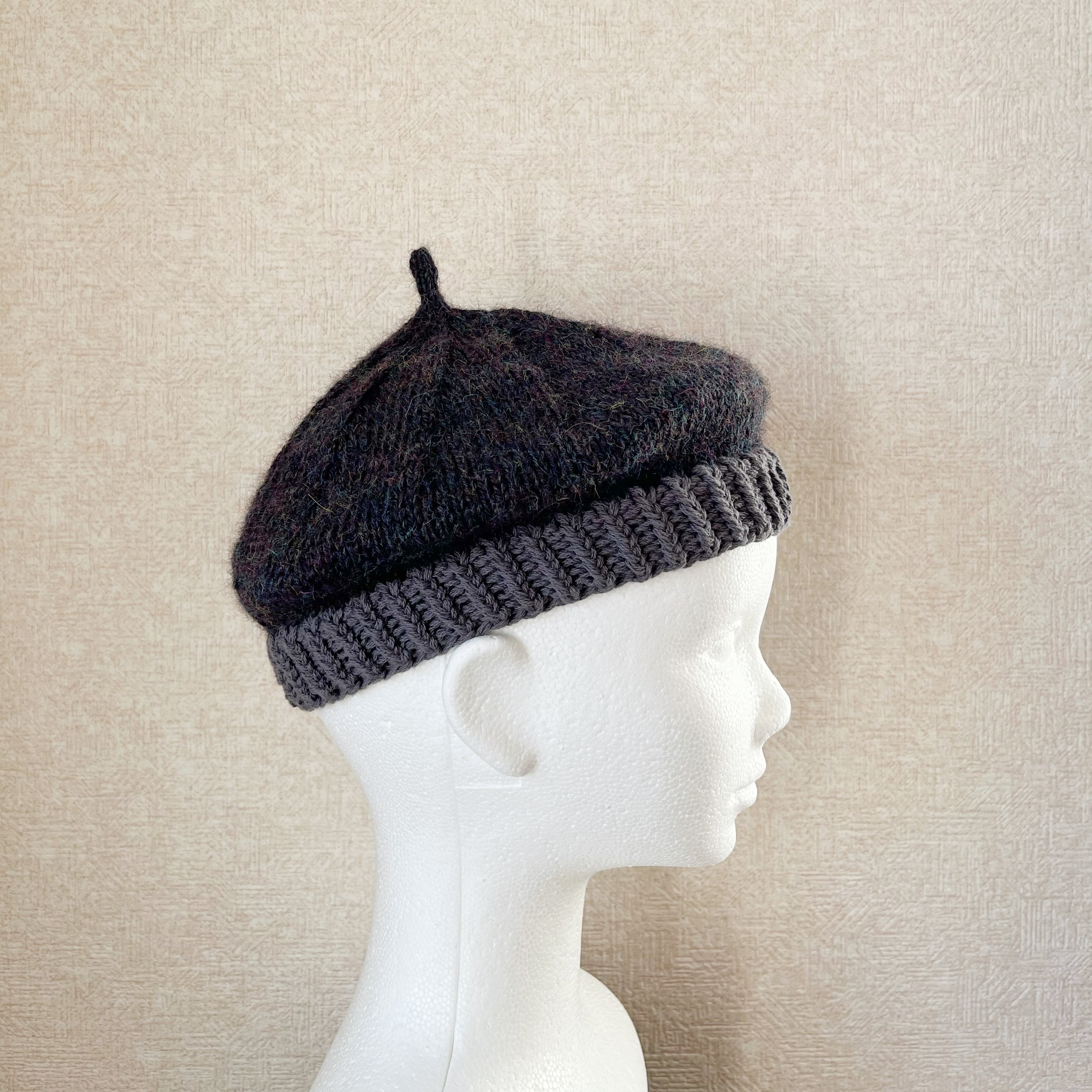 コットン素材のリブと、ウール糸のトップを組み合わせて編んだニットベレー帽です